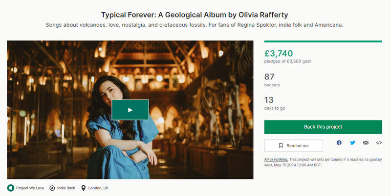 In her own words, it’s “songs about volcanoes, love, nostalgia, and cretaceous fossils. For fans of Regina Spektor, indie folk and Americana” - and it’s supported by no less than the UK’s Geologists Association. Olivia has produced the album herself, and started the Kickstarter campaign to cover an additional radio plugger, CD manufacturing and a filmed live session.